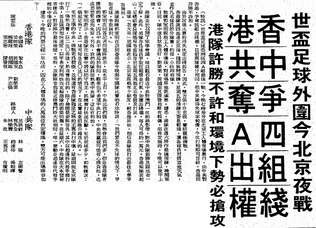 讓時光倒流至 1985 年,當時墨西哥世界盃外圍賽進行得如火如荼,香港第四次衝擊世界盃決賽周,與中國,汶萊,澳門同處亞洲區四 A 組。港隊首先於「埔頭」(政府大球場,今香港大球場)與中國互交白卷,繼而雙殺汶萊和澳門,惜因得失球差,一直屈居中國之下,守在小組次席。小組最後一輪比賽,正是香港隊與中國隊再度交鋒。港隊非但要千里迢迢作客北京工人體育場,更必須取勝以得出線權。反觀中國隊,只需守和港隊即可出線。